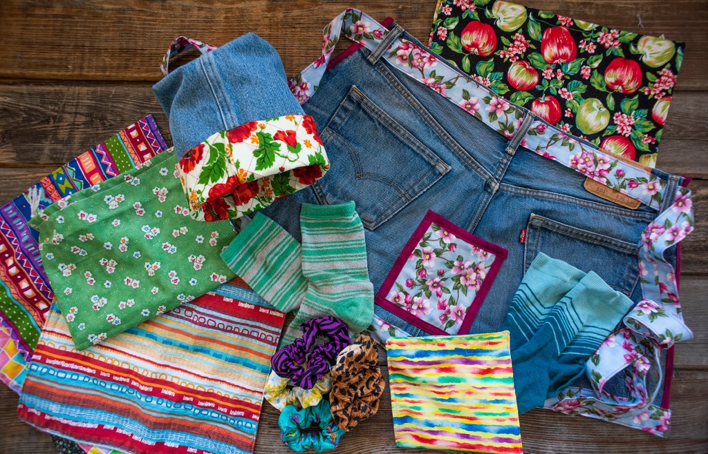 There have been lots of small sewing projects these days. As much as I love making quilts, it’s also satisfying to sew little items that can be completed in a few hours, rather than months! Some things I’ve made recently: little drawstring gift bags, reusable sandwich wraps, scrunchies (they’re very on-trend again!), reusable snack bags, an upcycled apron and a cute thread basket made from vintage Levis, and of course bread bags. Lots of bread bags. I love making useful things that eliminate single-use plastic waste, and I love reusing sturdy fabric like denim – most jeans that are thrown out only have one or two holes, and the rest is in great shape. I’m learning how to patch jeans and darn socks, too! Here’s a fun tip: take all your clothes that need mending and stack them away in a corner of your sewing attic. Many months later, tackle that pile and return the newly-repaired clothes to your closet. Magic! It’s like a whole new wardrobe for free! (P.S. The fashion industry is devastating to the environment. Each American throws away about seventy pounds of textiles each year; most of that is fully recyclable. Instead of buying cheap new clothing, consider mending what you own, swapping with friends, buying secondhand or shopping your own closet.)