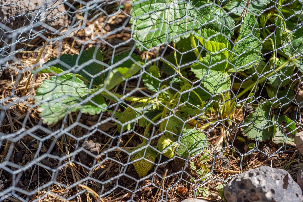 And finally, I’m hopeful that the strawberry plants we put in last spring will bear fruit this year. There are certain fruits and vegetables where the difference between homegrown and storebought is as vast as the Grand Canyon: tomatoes are obviously one example, and strawberries are definitely another. The standard Driscoll’s berries in the plastic box are fine, of course, but a just-picked, sun-warmed strawberry has a sparkling intensity of flavor that can never be matched by mass-produced California berries. Unfortunately, those amazing berries are also coveted by birds, squirrels and rabbits, so as usual, we built in layers of protection. You might think that Quiet Farm is entirely constructed from chicken wire and hardware cloth – which is mostly true! – but we would actually like to enjoy the fruits of our labors.