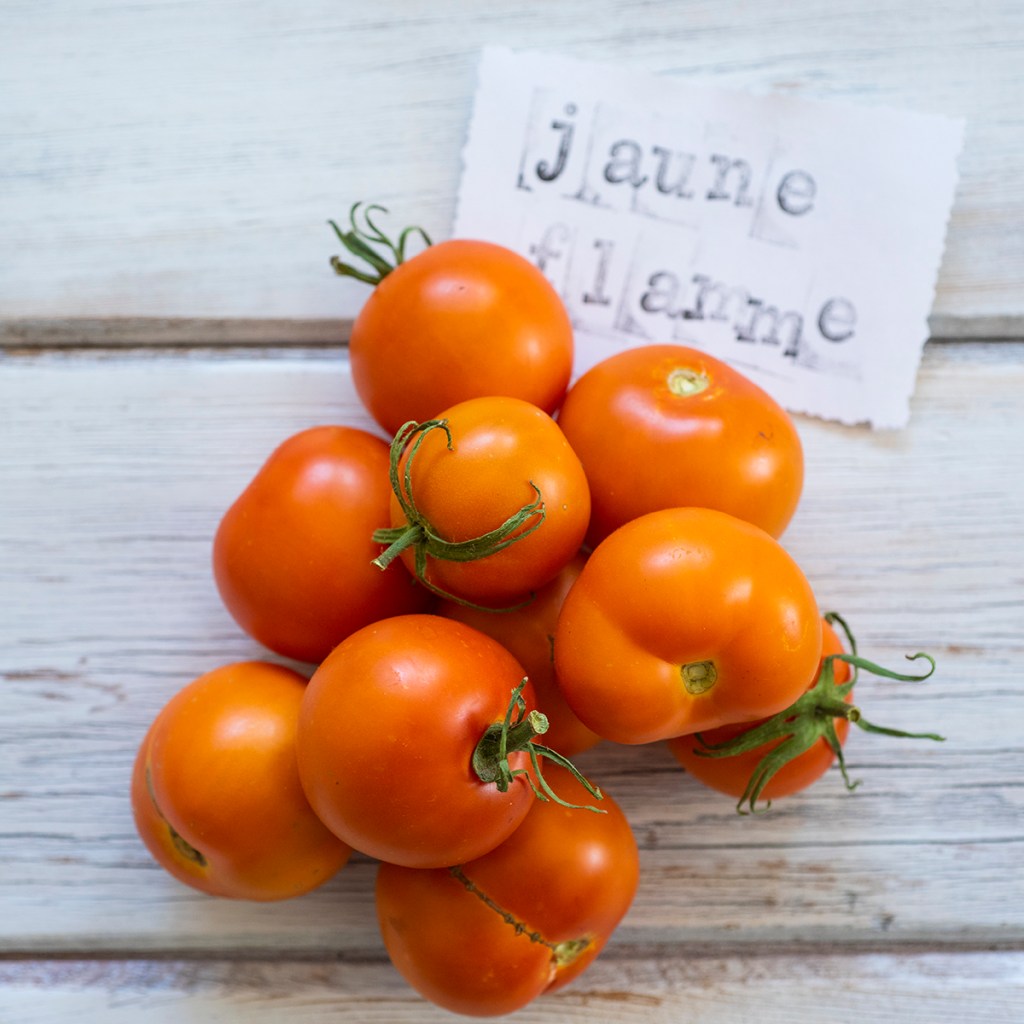 Jaune Flamme, meaning “yellow flame” in French, has quickly become one of our favorite tomatoes. It’s medium-size, about a golf ball or a bit larger, with abundant fruits and sparky flavor. Here, at least, it presents as more fiery orange than yellow, and it makes a stunning golden tomato sauce or soup. On the downside, this was the only tomato where we observed blossom end rot this year which may doom it for future plantings if the trend continues.